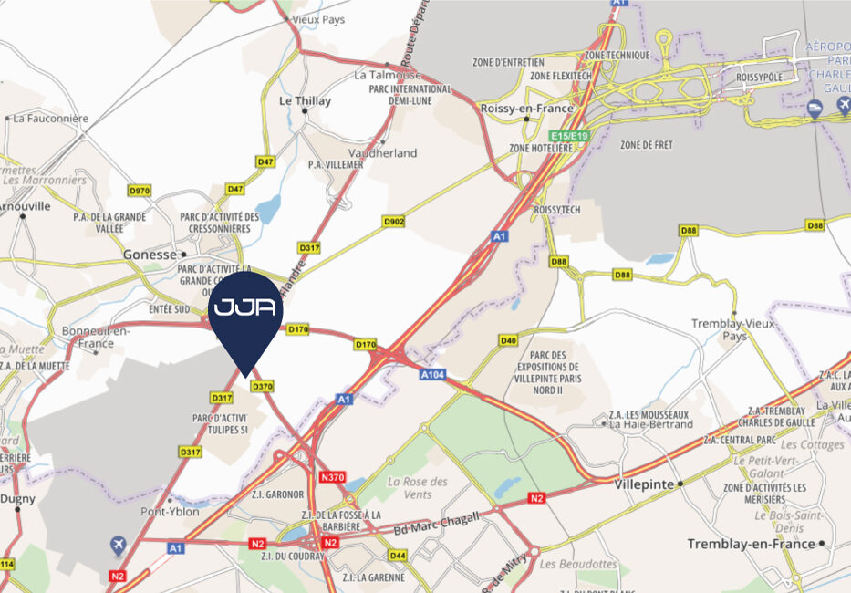 De l’aéroport Roissy-Charles de Gaulle : Prendre l’A3 direction Cergy-Pontoise, suivre Marne-la-Vallée/Sarcelles/Z.I Paris Nord/ Parc des Expositions puis l’A104 Gonesse et la D170 Gonesse/S41 Gonesse (environ 15 min). De Paris : Prendre l’A1 Dir Sarcelles/Ch. De Gaulle, puis suivre l’A3 Aulnay s/ Bois (environ 20 min)