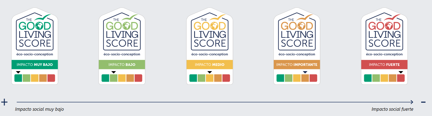 The Good Living Score mide el impacto medioambiental y social de un producto y lo clasifica en 5 niveles, siendo el primero el de «IMPACTO MUY BAJO» hasta «IMPACTO FUERTE» : así, podemos hablar de diseño eco-socio-responsable.