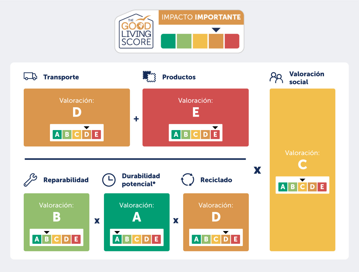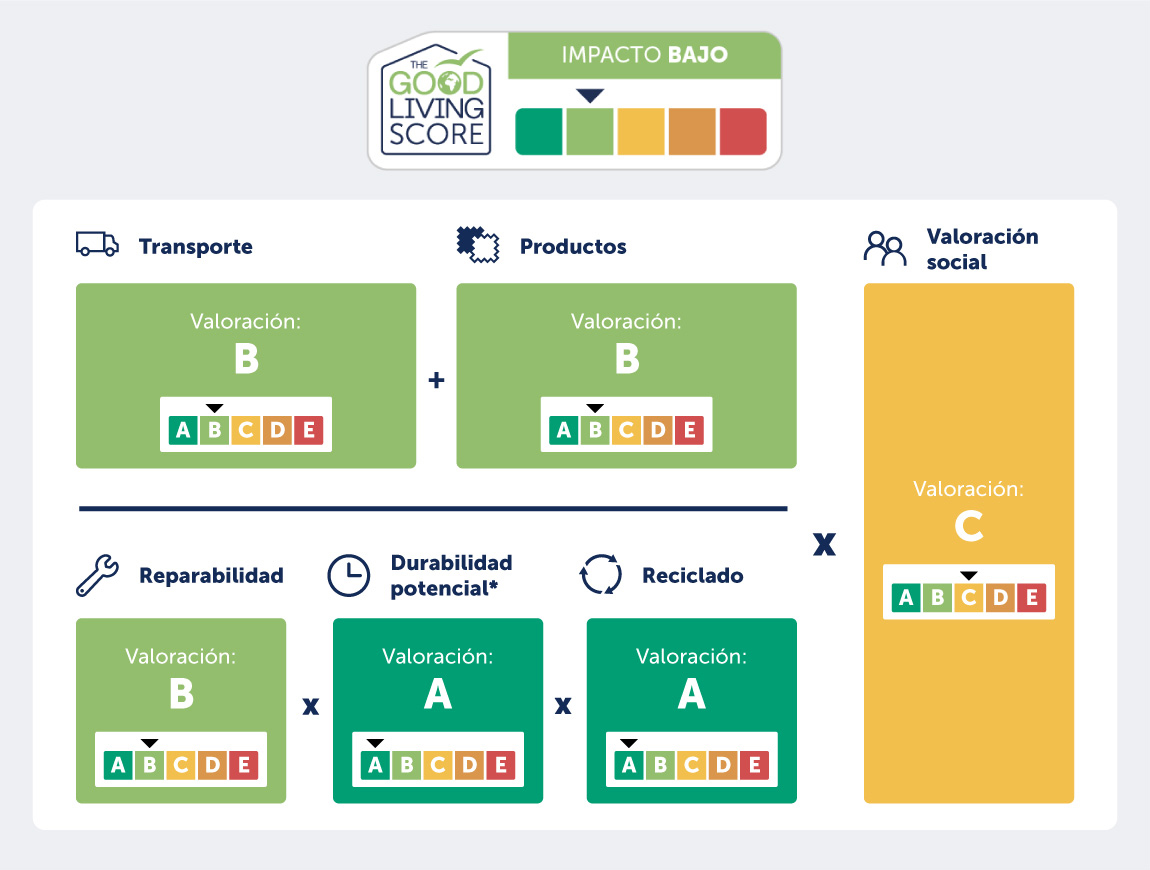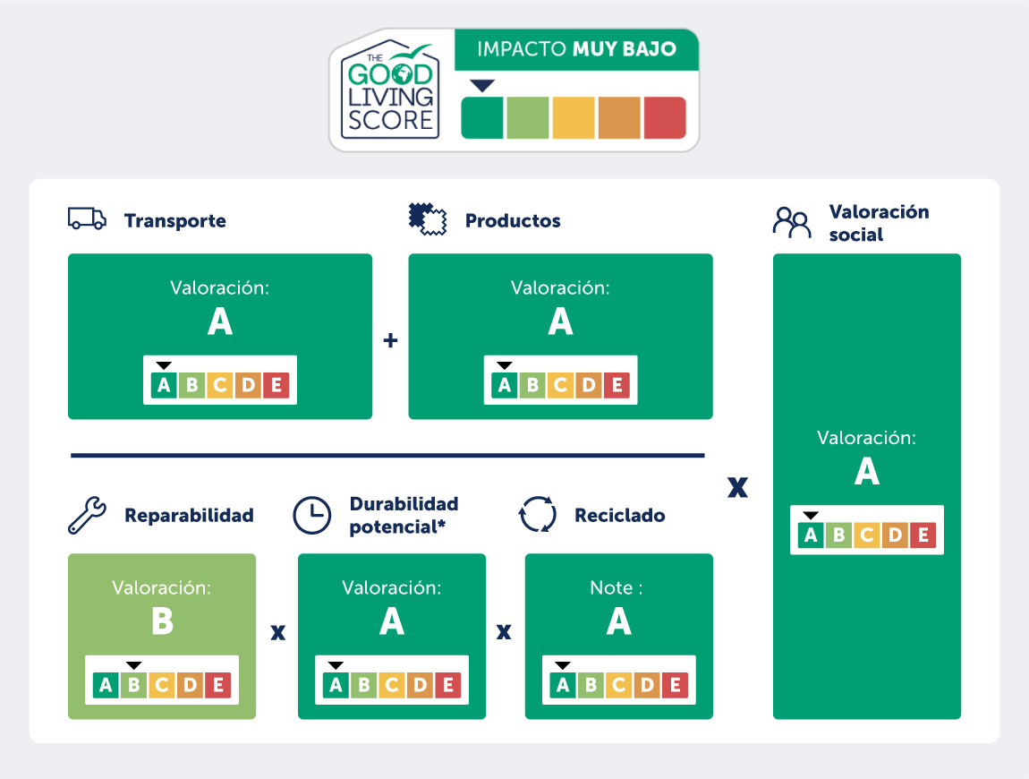 The Good Living Score mide el impacto medioambiental y social de un producto y lo clasifica en 5 niveles, siendo el primero el de «IMPACTO MUY BAJO» hasta «IMPACTO FUERTE» : así, podemos hablar de diseño eco-socio-responsable.