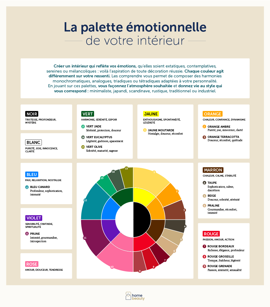 Chaque couleur agit différemment sur votre ressenti. Les comprendre vous permet de composer des harmonies monochromatiques, analogues, triadiques ou tétradiques adaptées à votre personnalité. En jouant sur ces palettes, vous façonnez l’atmosphère souhaitée et donnez vie au style qui vous correspond : minimaliste, japandi, scandinave, rustique, traditionnel ou industriel.